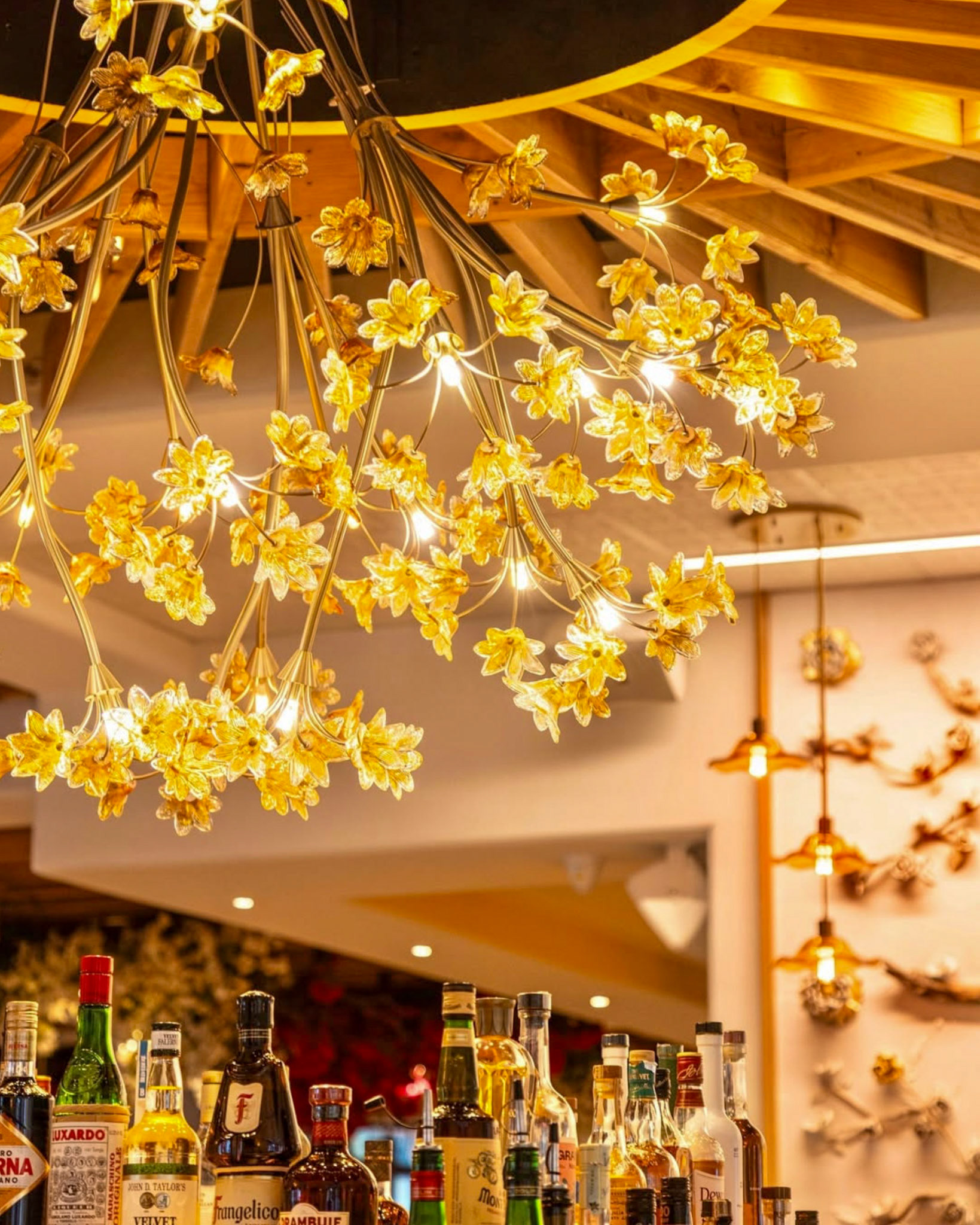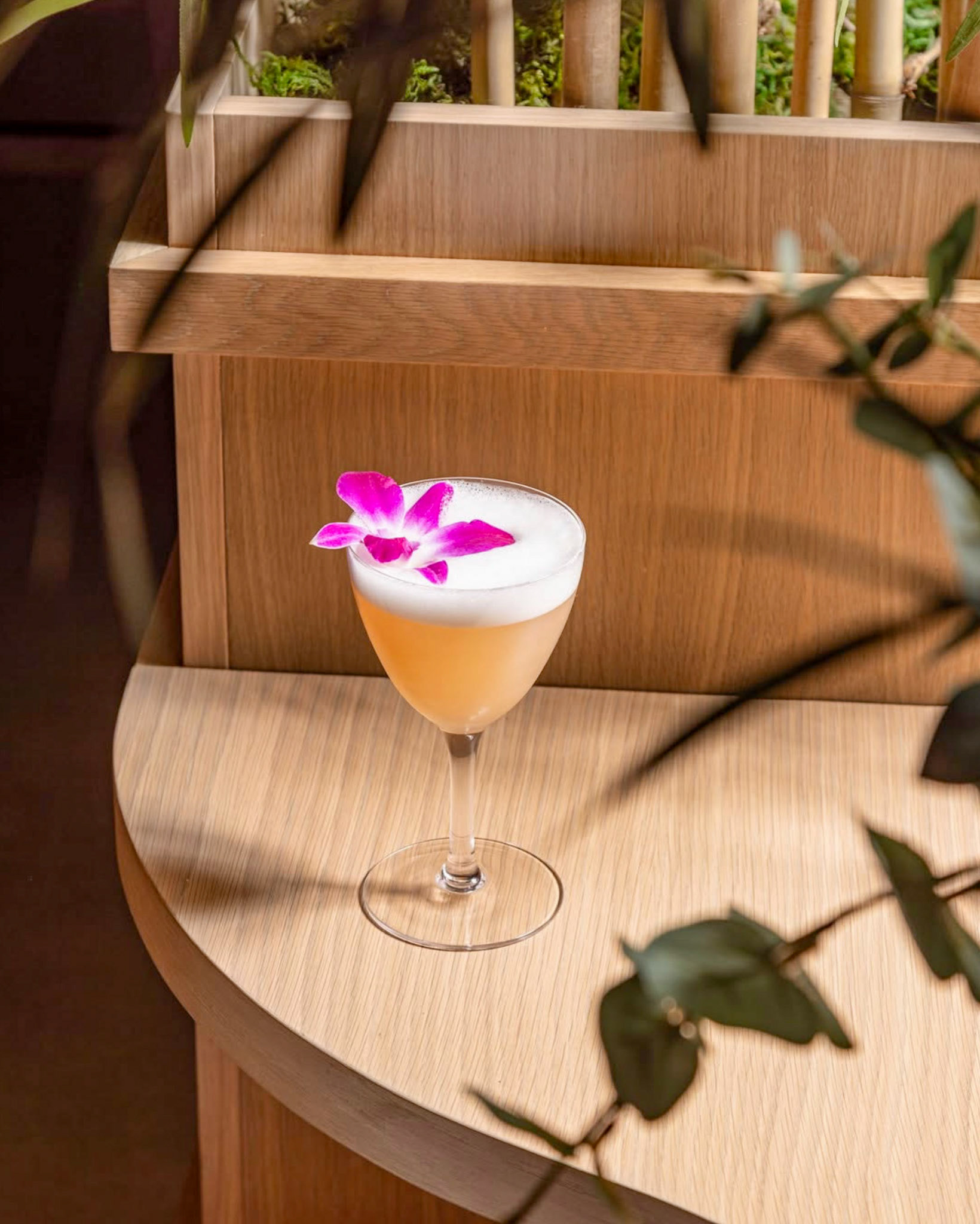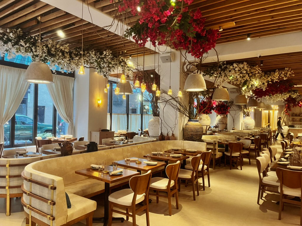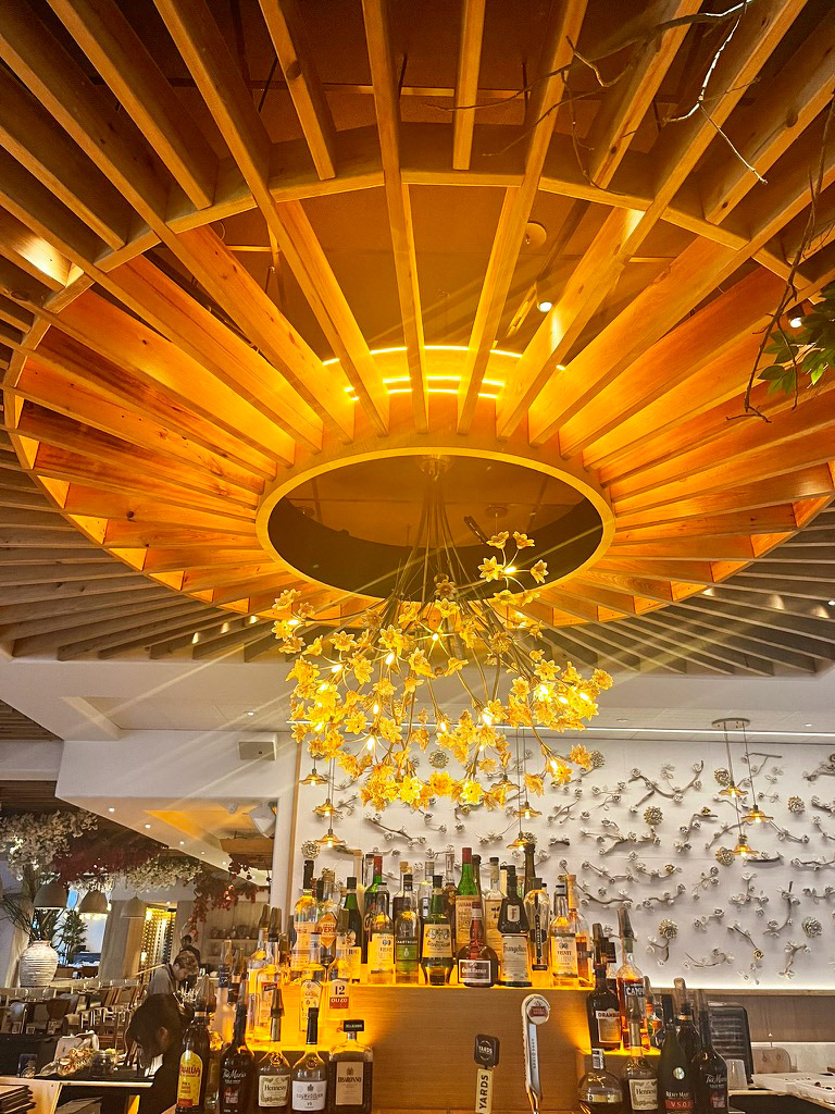 The design centers around a sculptural radial ceiling of warm timber, radiating outward like a sunburst and grounding the bar as the heart of the space. Bougainvillea canopies unfurl throughout the dining rooms, weaving color and movement overhead while soft, diffused daylight enters through linen-draped windows, creating a serene interplay between brightness and shadow.