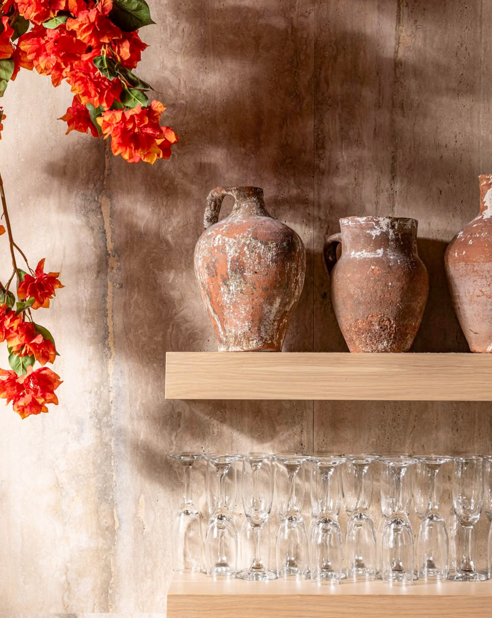 Curved banquettes, handcrafted pottery, and natural stone surfaces introduce a tactile materiality—each element selected for its quiet authenticity and connection to craftsmanship. A glass-enclosed wine room forms a luminous architectural moment, balancing transparency with structure. Custom lighting, from botanical pendants to textured concrete shades, enriches the vertical space and reinforces Almyra’s sense of narrative and place.