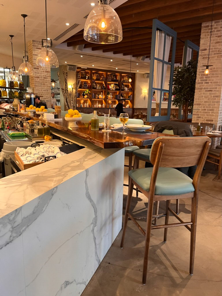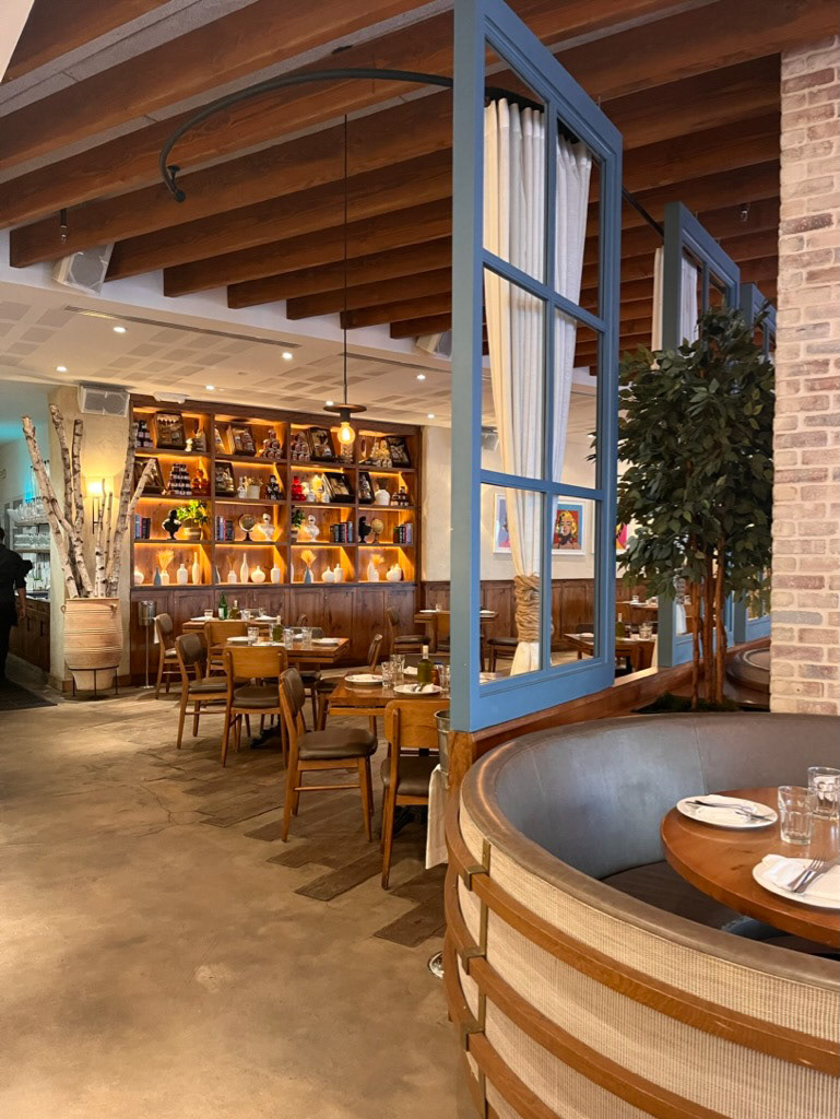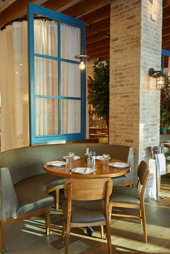Thoughtful materiality, curved banquettes, natural oak furnishings, and contemporary Greek-inspired artwork complete the experience, shaping a welcoming restaurant environment rooted in authenticity, comfort, and modern Mediterranean design.