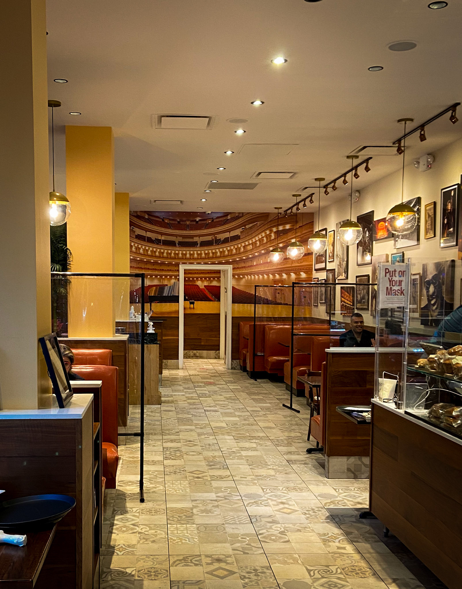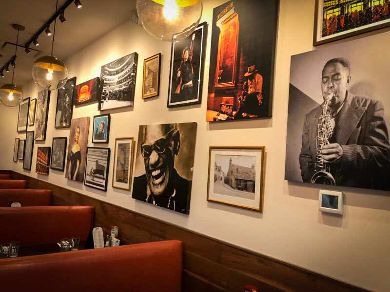 The signature visual identity of Carnage Diner & Café comes alive on its walls: a gallery of black-and-white jazz portraits, vintage New York illustrations, theater-inspired scenes, and nostalgic imagery of everyday café culture. These curated art moments transform the space into an informal cultural gallery—celebrating music, performance, coffee, community, and the city itself. At the far end, a dramatic mural of a grand concert hall deepens the narrative, adding a cinematic flourish to the guest journey.