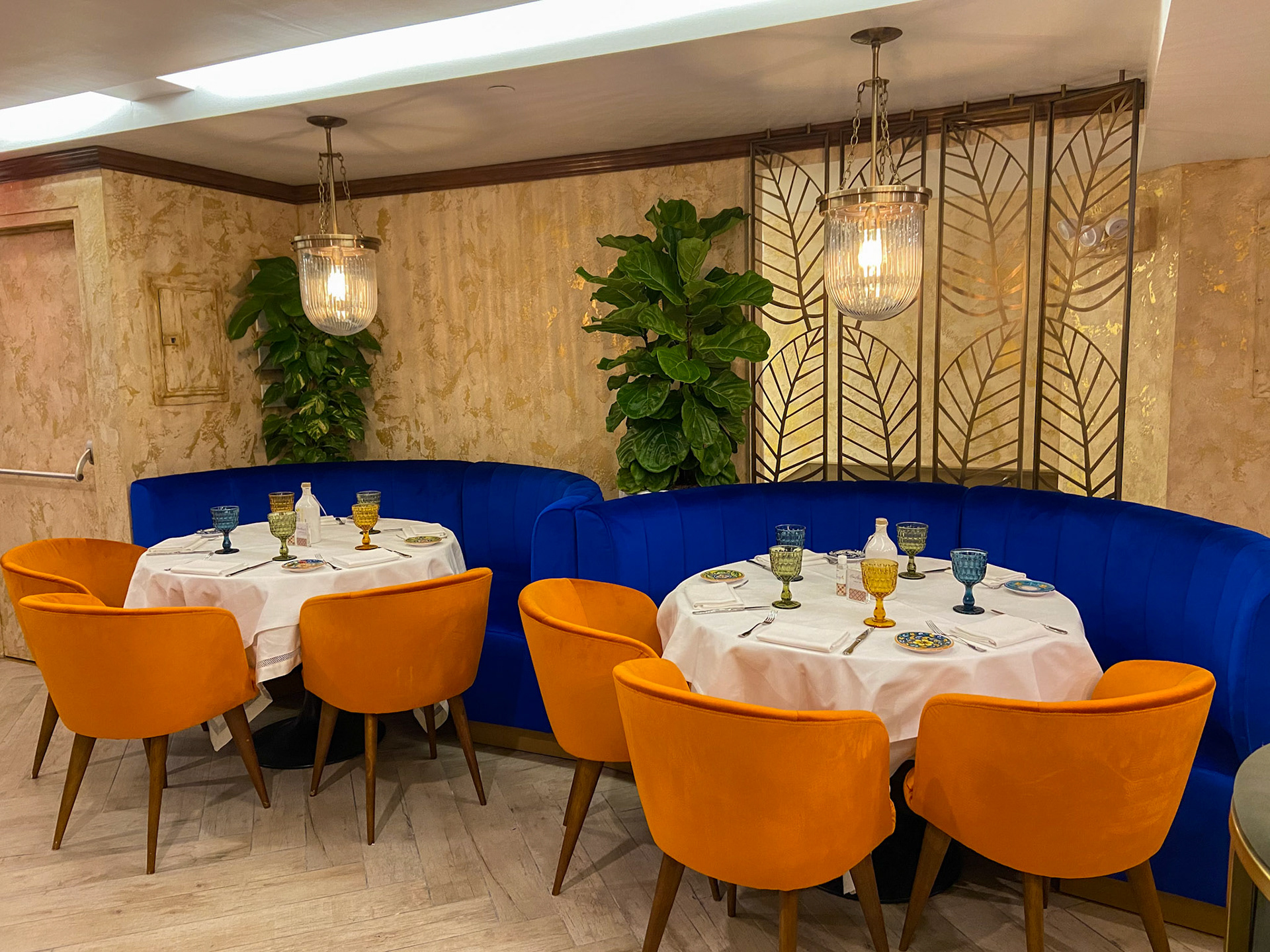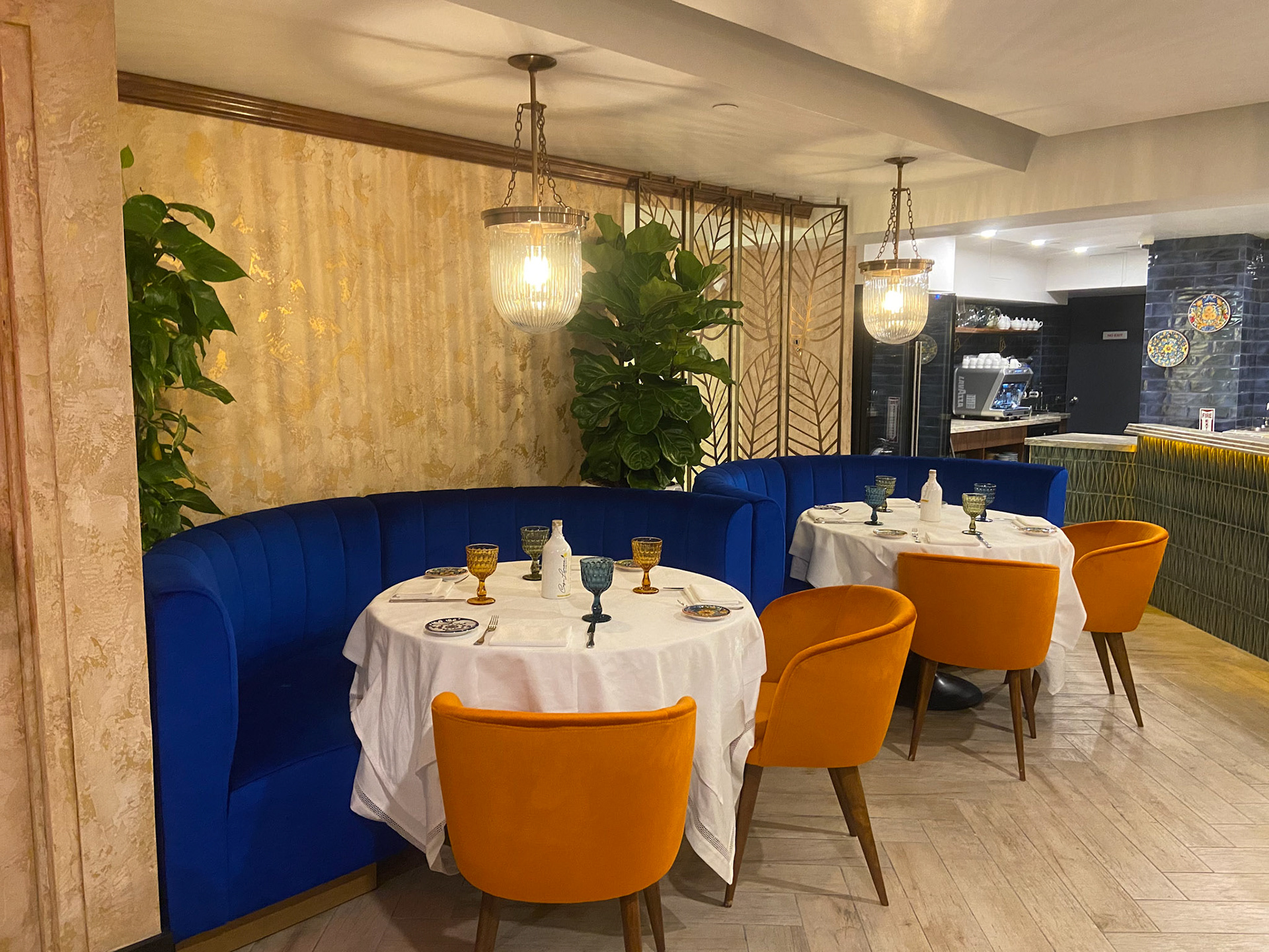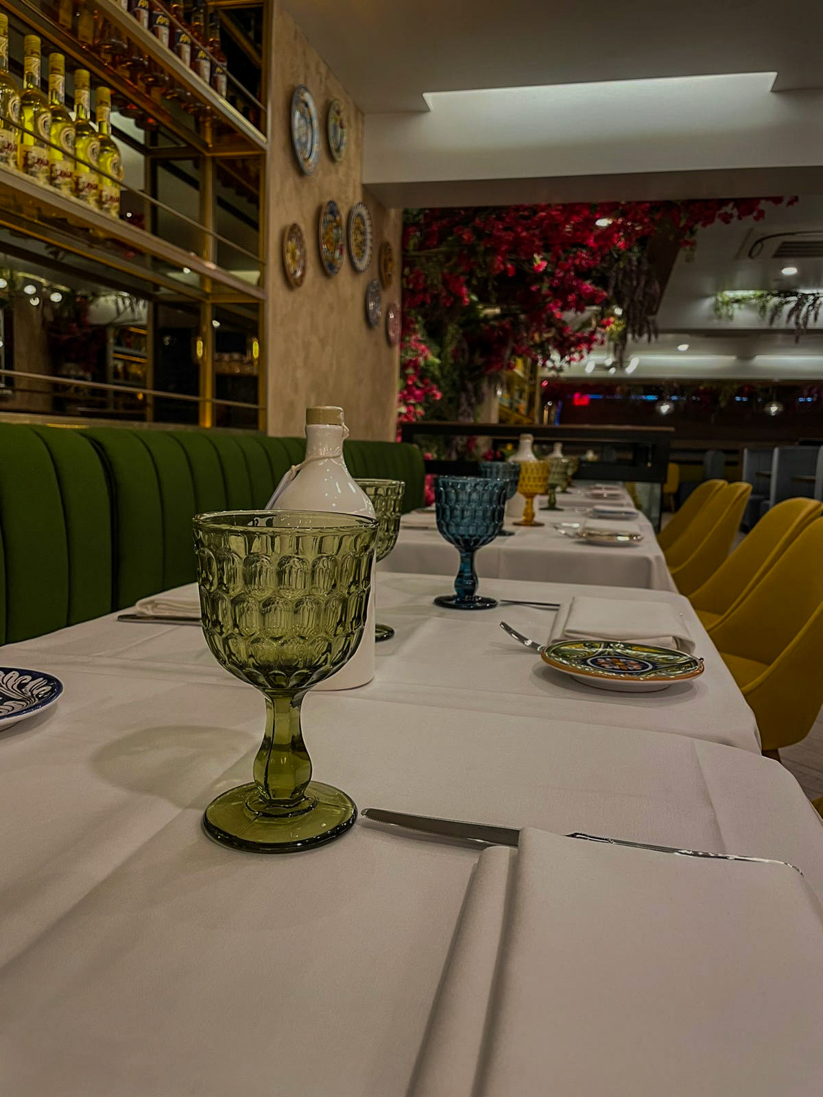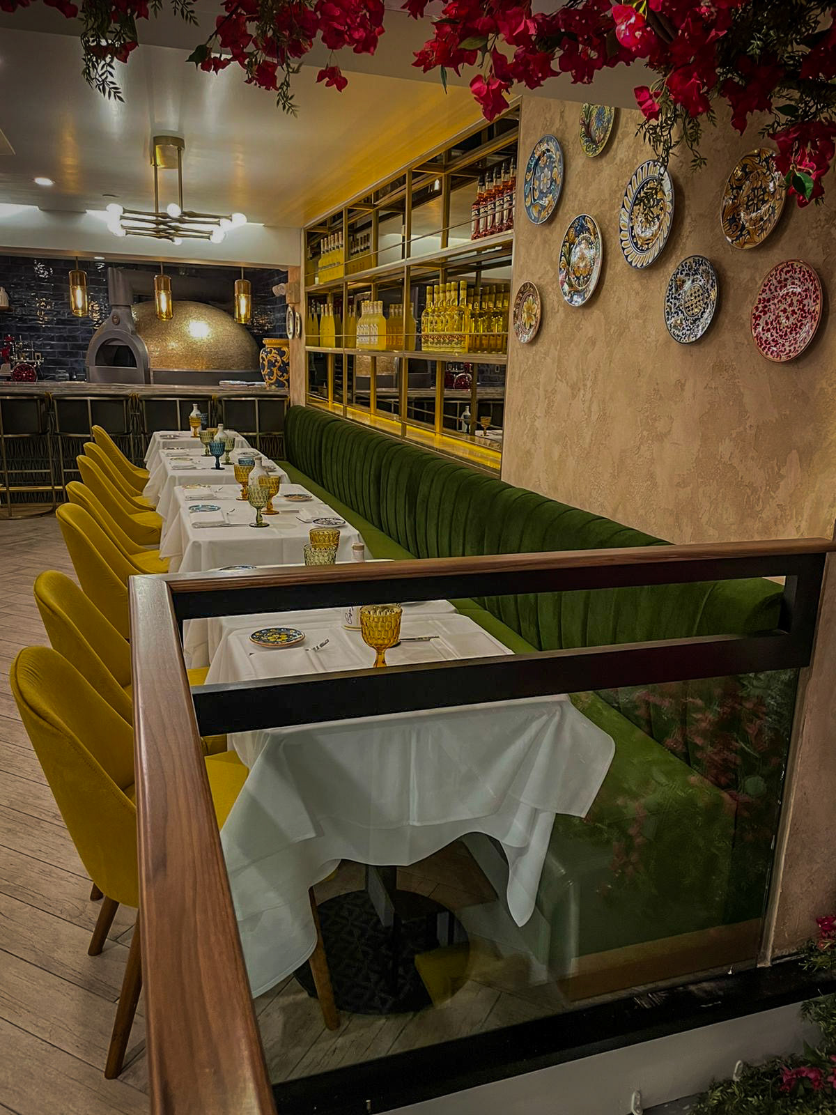 From the moment guests enter, they are embraced by a palette inspired by the Amalfi sun: deep saffron yellows, cobalt blues, citrus oranges, and lush Mediterranean greens. These bold tones echo throughout the space, brought to life in plush velvet chairs, sculptural banquettes, and a curated mix of artisanal tablewares that crown each setting like small works of art.