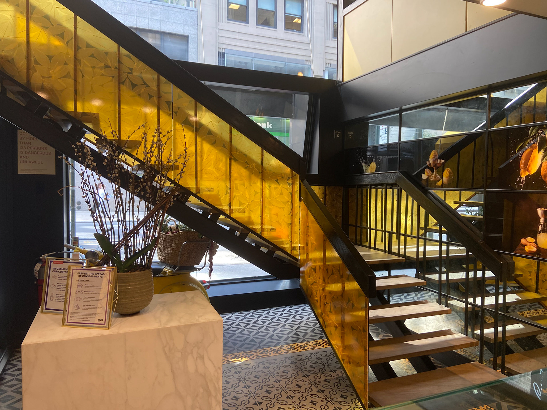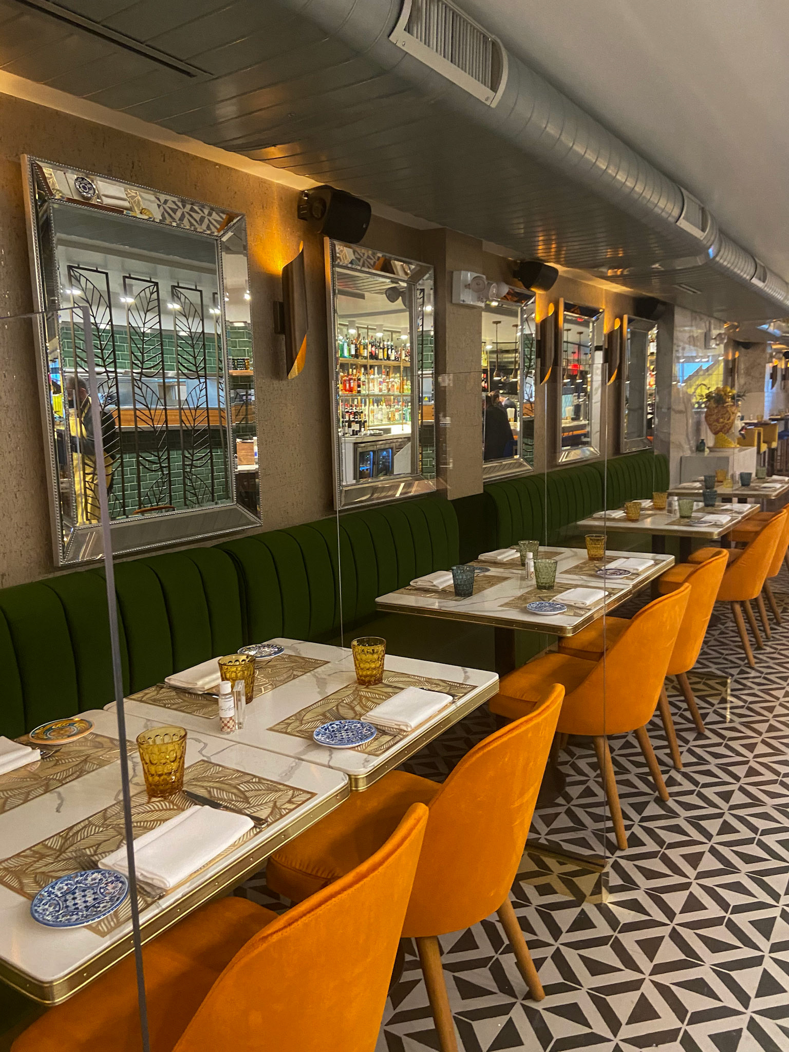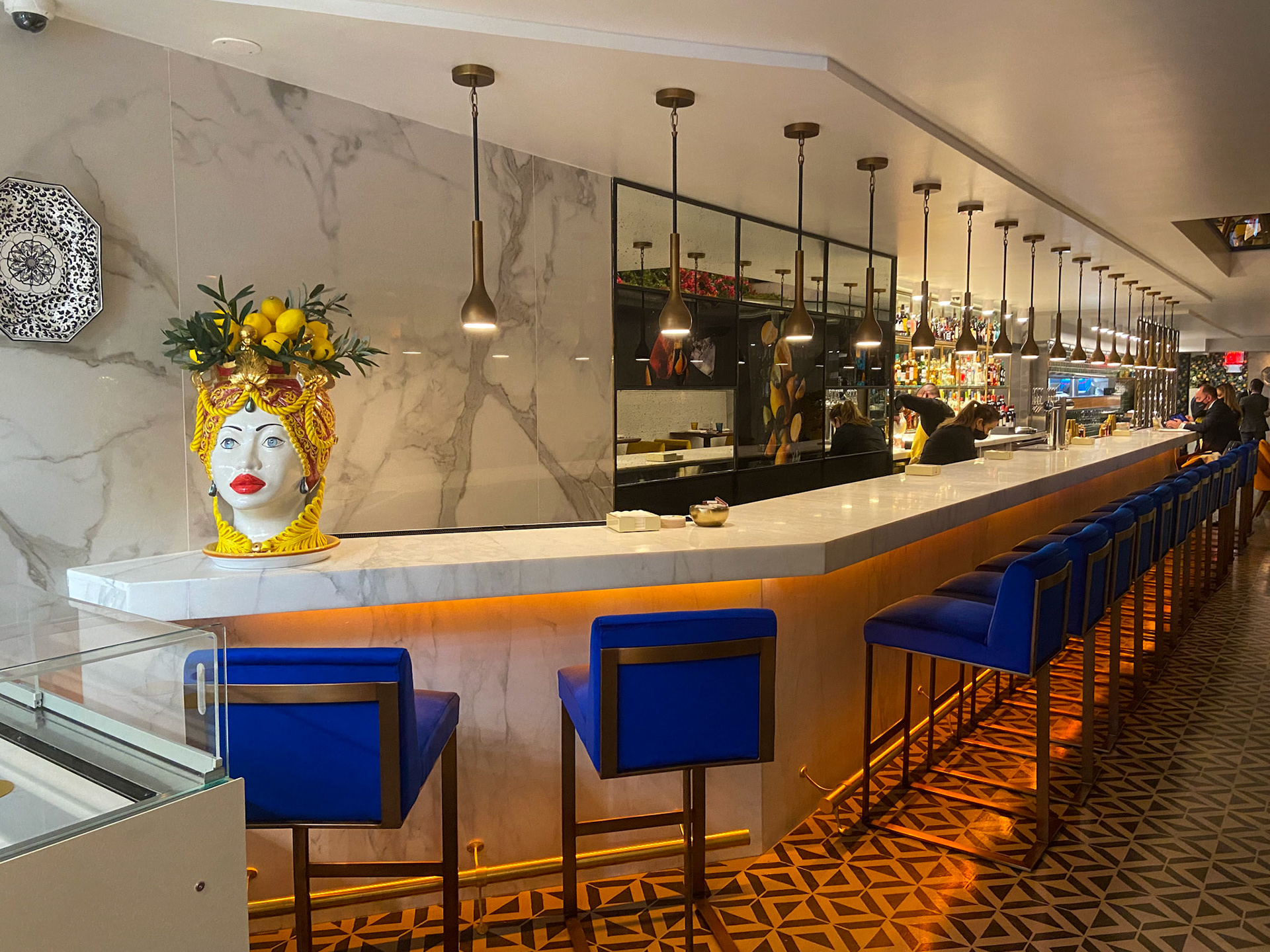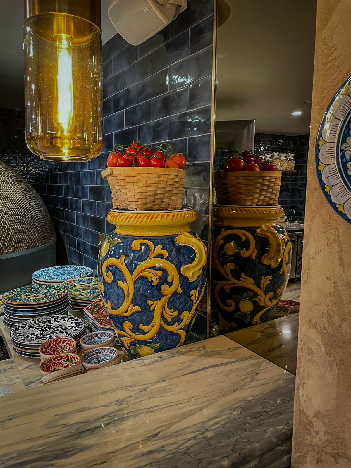 From the moment guests enter, they are embraced by a palette inspired by the Amalfi sun: deep saffron yellows, cobalt blues, citrus oranges, and lush Mediterranean greens. These bold tones echo throughout the space, brought to life in plush velvet chairs, sculptural banquettes, and a curated mix of artisanal tablewares that crown each setting like small works of art.