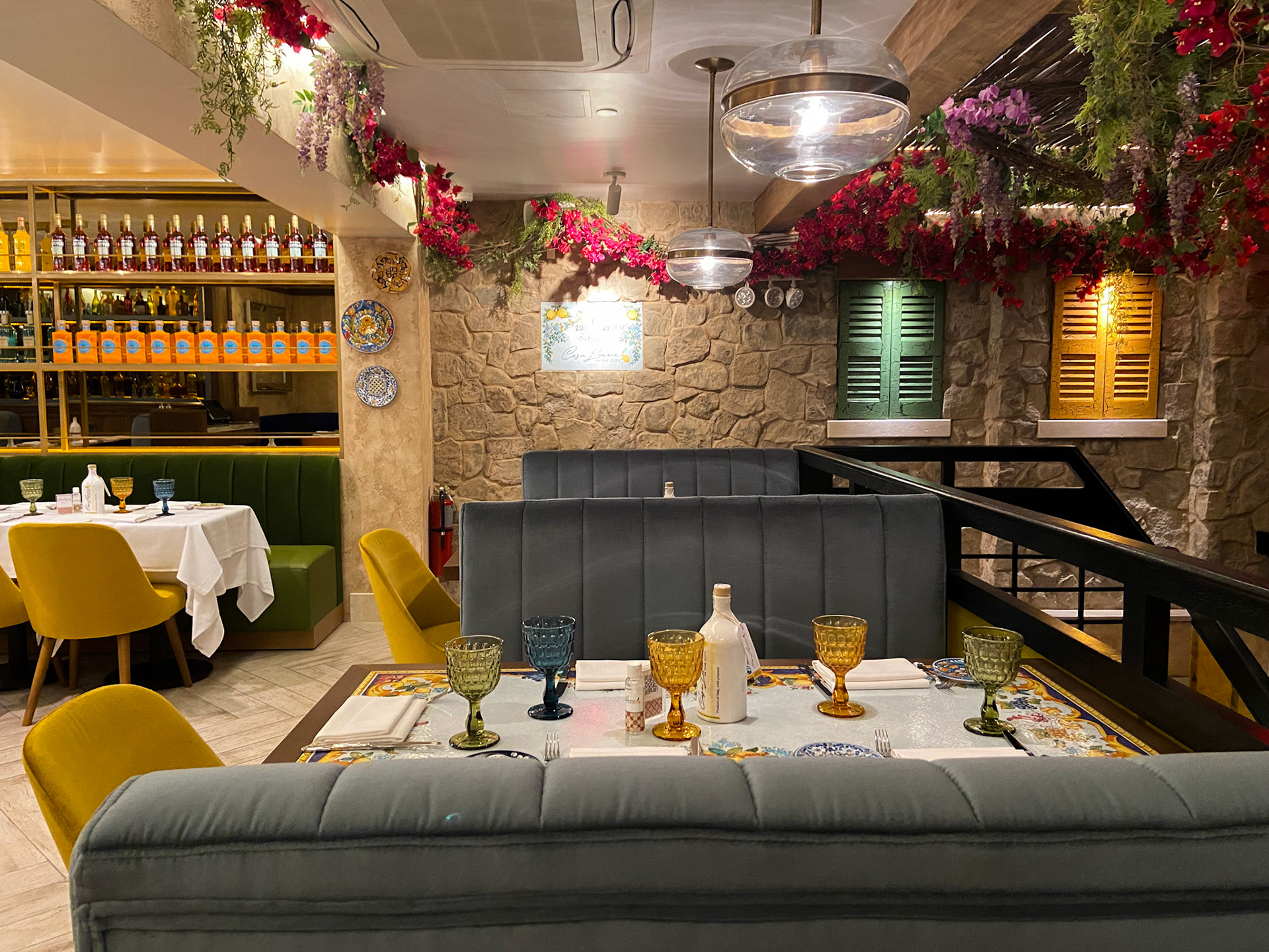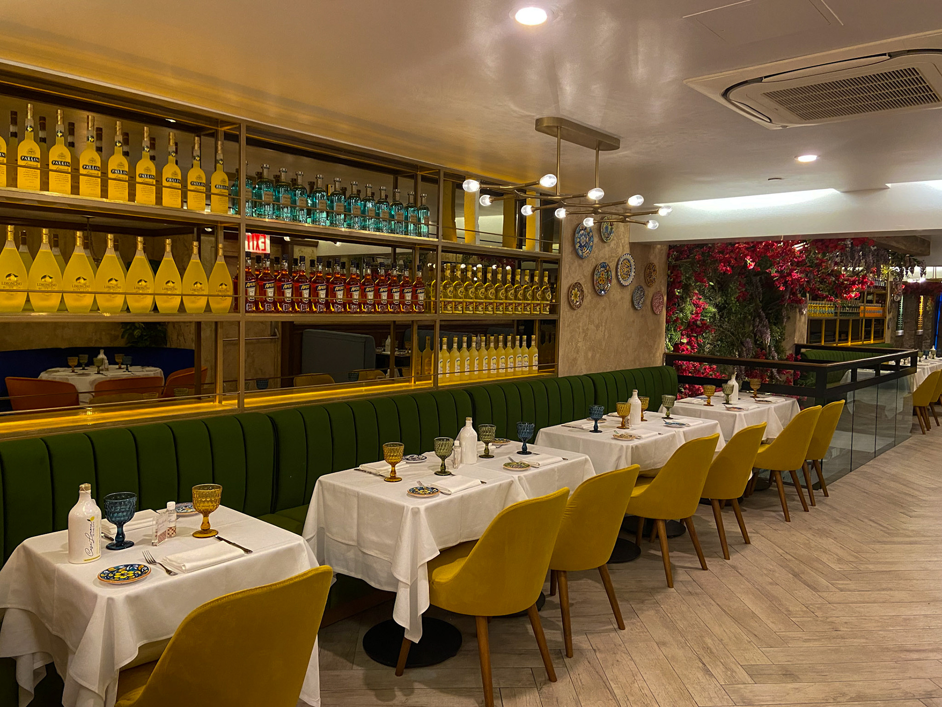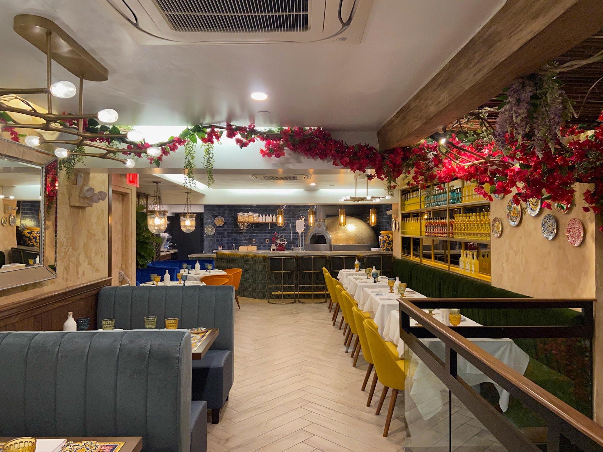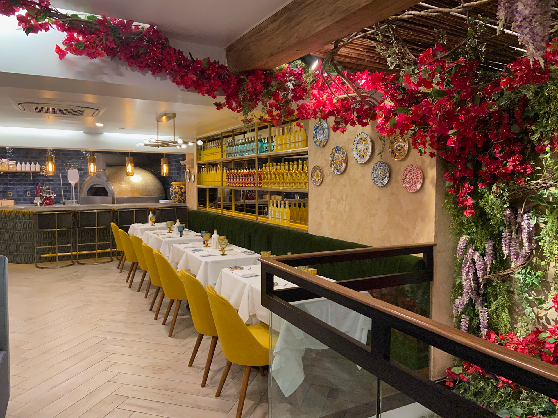 Lighting plays a starring role: glass pendants and brass fixtures cast a golden glow that evokes the romance of an evening in Sorrento. Overhead, whimsical floral canopies of bougainvillea and wisteria create an intimate, garden-like atmosphere, transforming the ceilings into a theatrical Mediterranean arbor.
