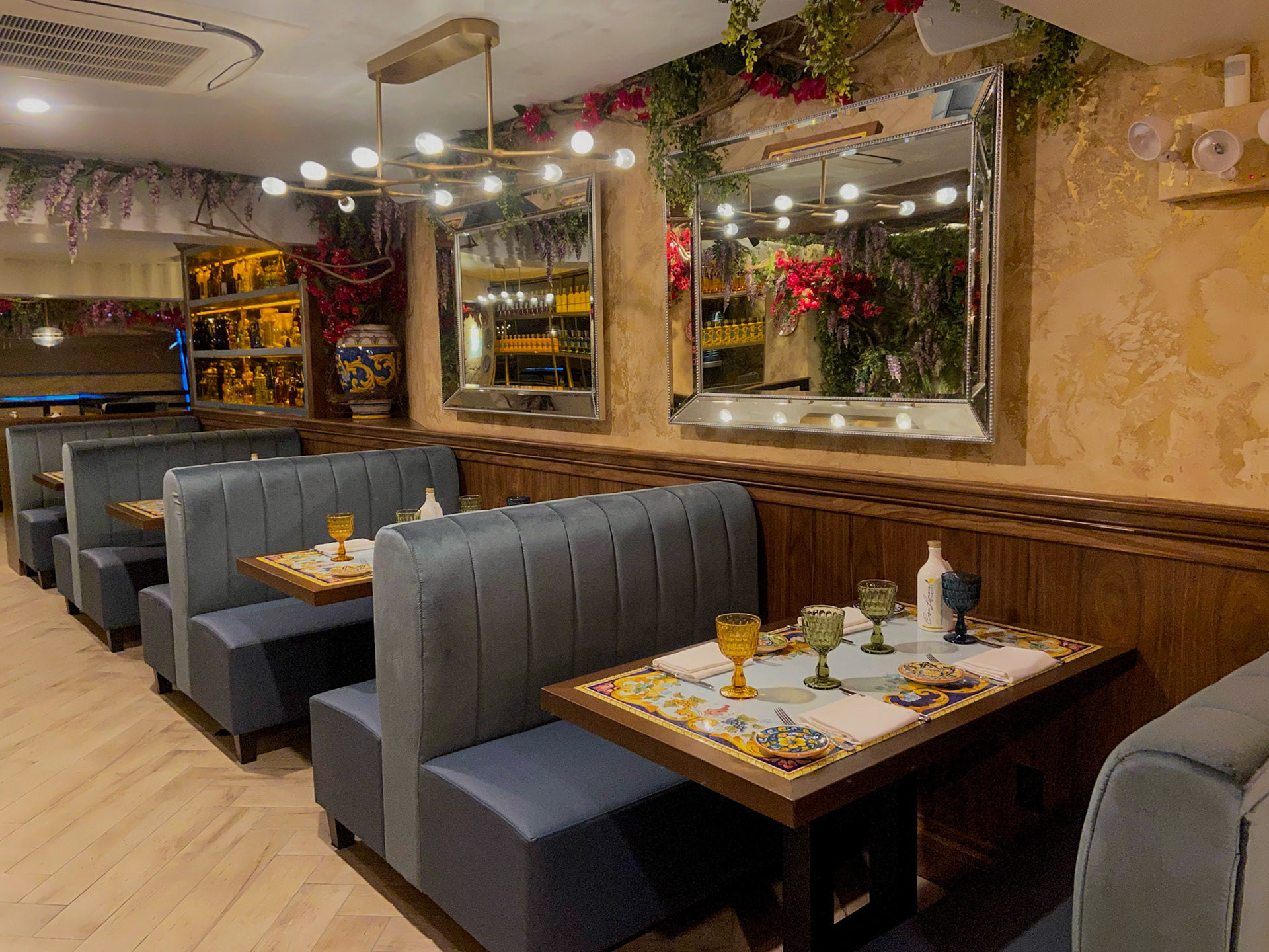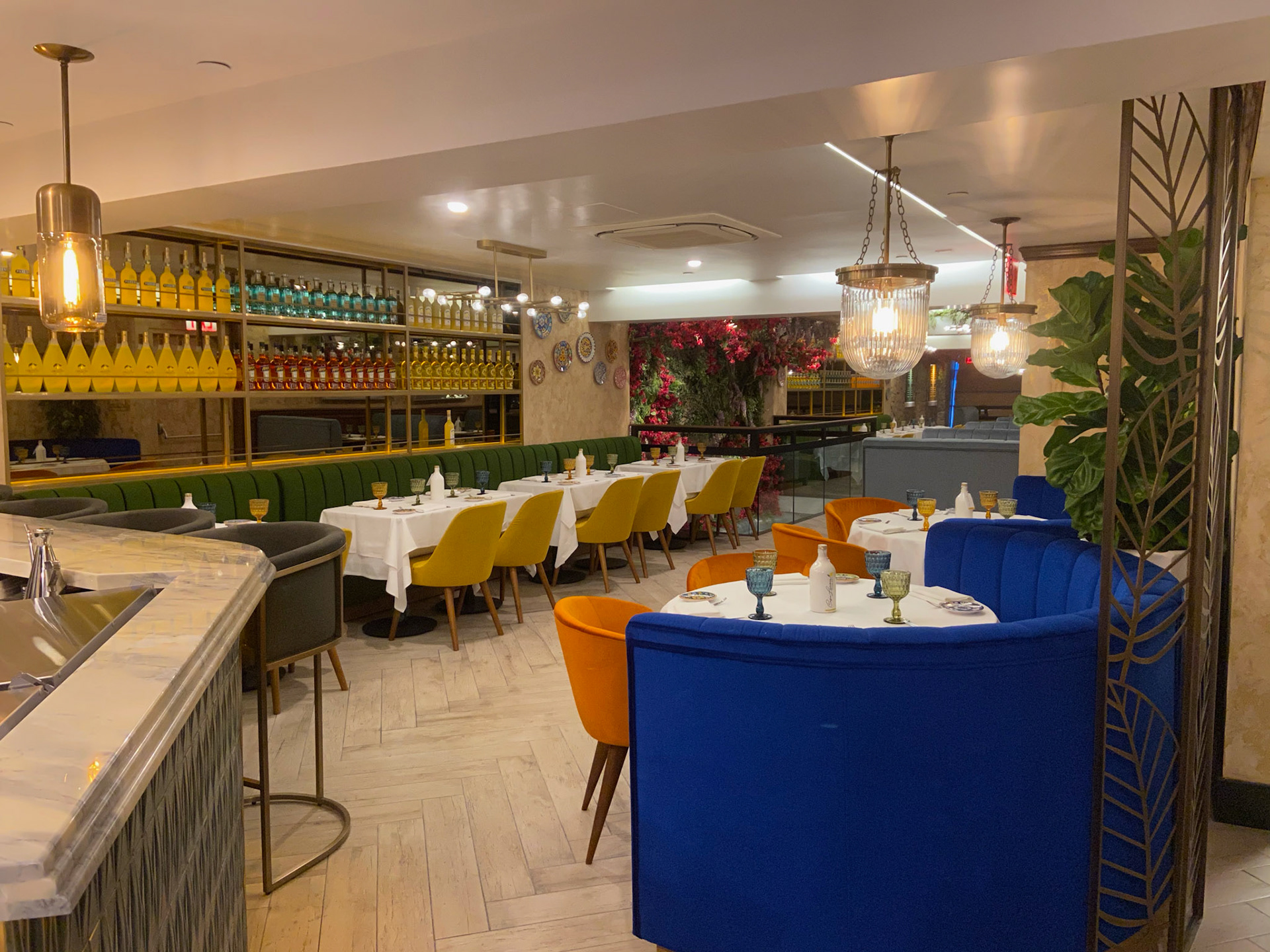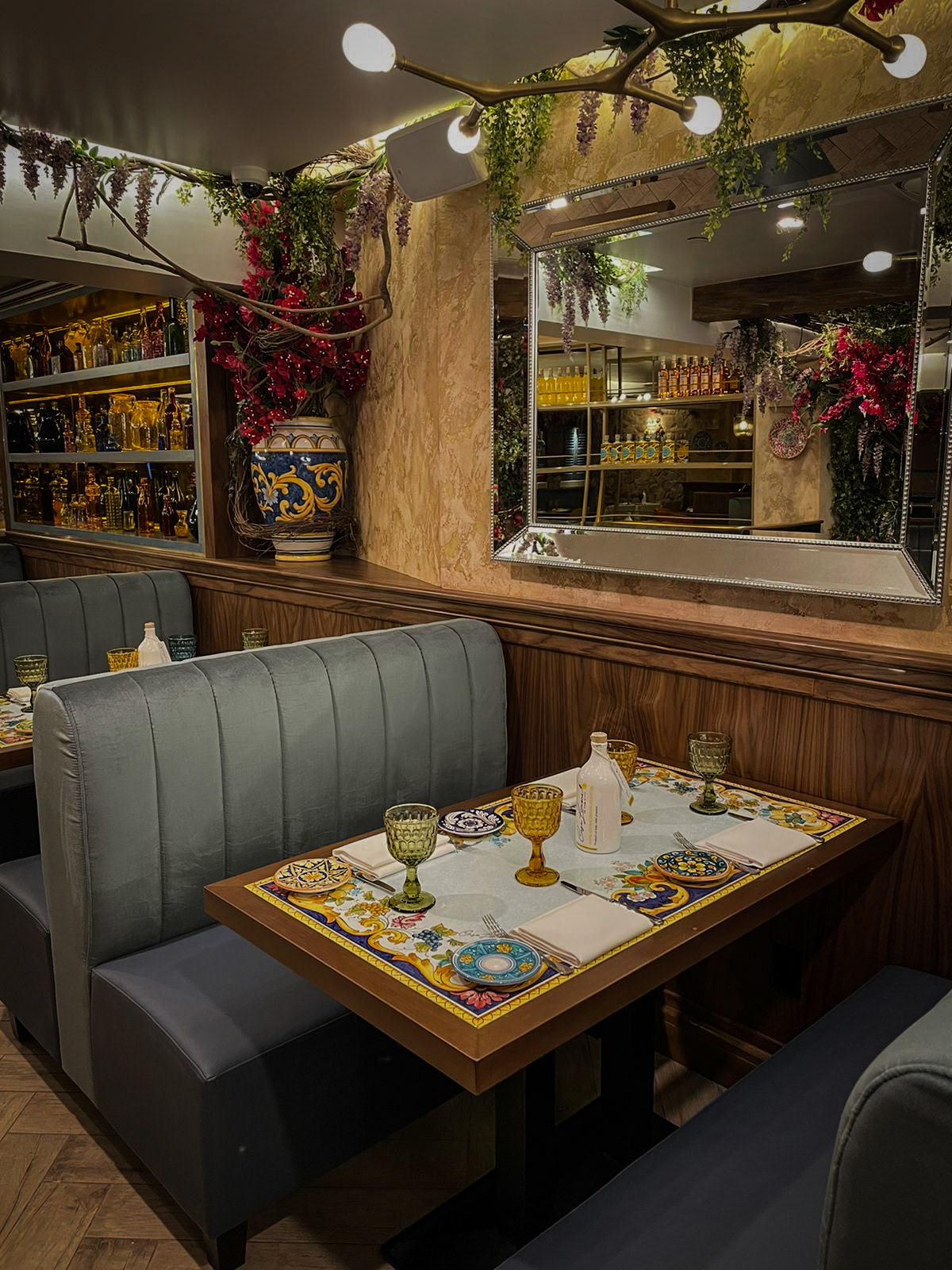 Lighting plays a starring role: glass pendants and brass fixtures cast a golden glow that evokes the romance of an evening in Sorrento. Overhead, whimsical floral canopies of bougainvillea and wisteria create an intimate, garden-like atmosphere, transforming the ceilings into a theatrical Mediterranean arbor.