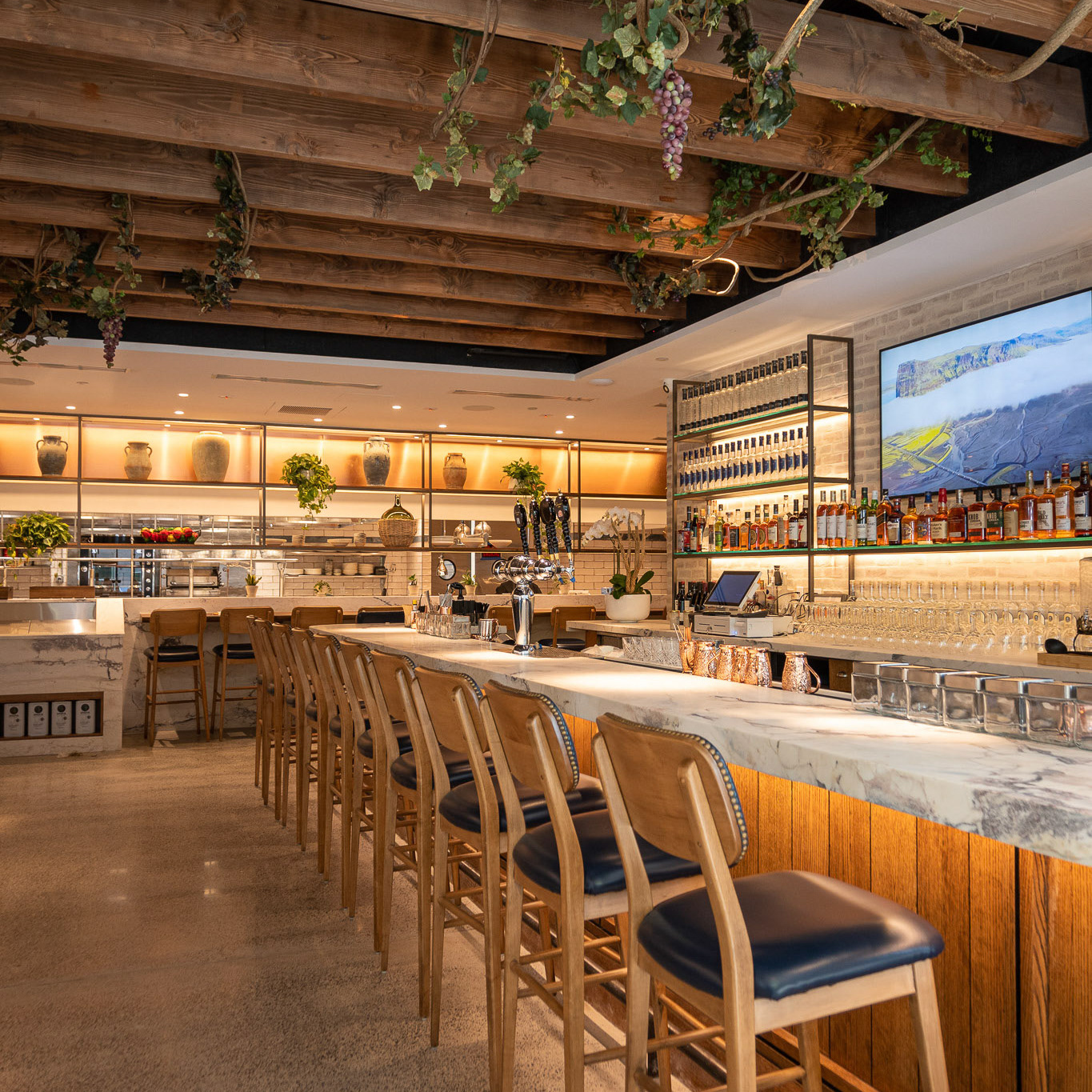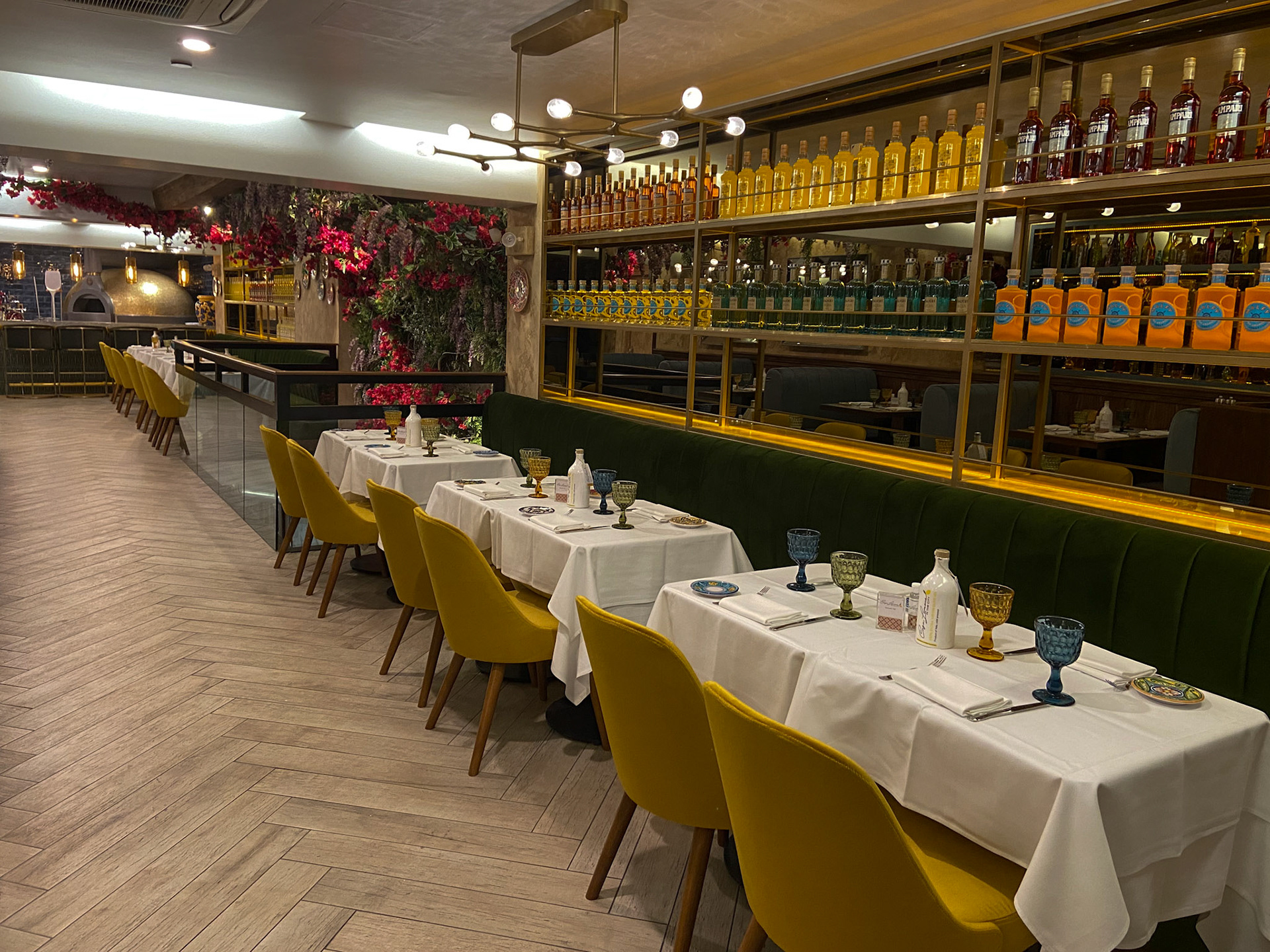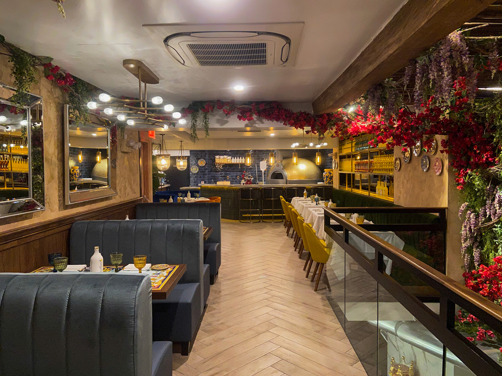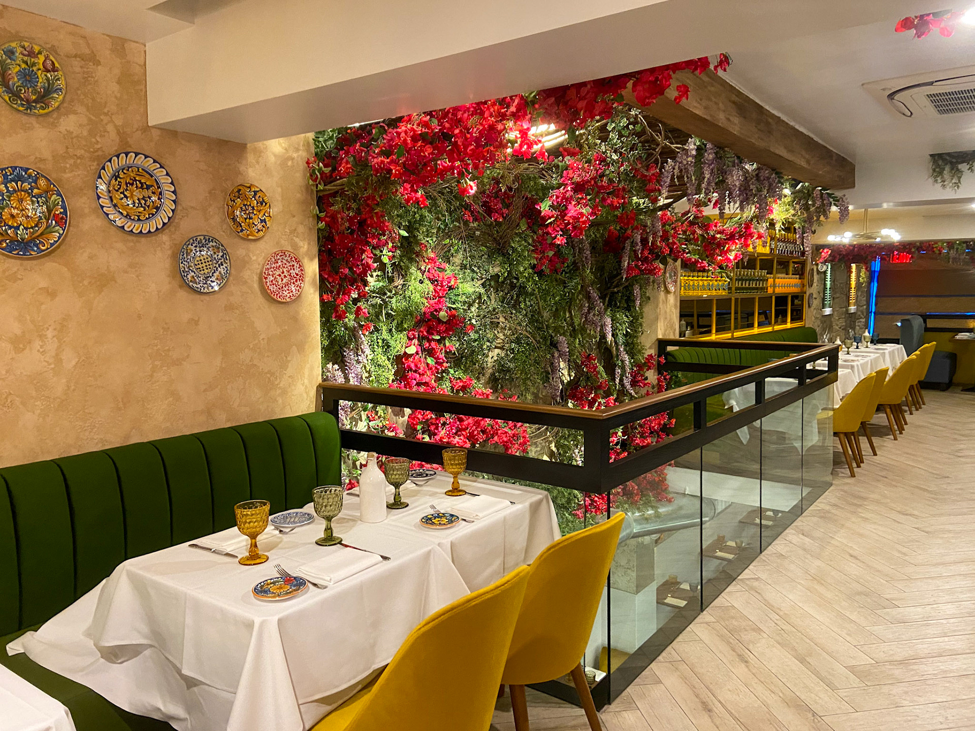 Lighting plays a starring role: glass pendants and brass fixtures cast a golden glow that evokes the romance of an evening in Sorrento. Overhead, whimsical floral canopies of bougainvillea and wisteria create an intimate, garden-like atmosphere, transforming the ceilings into a theatrical Mediterranean arbor.