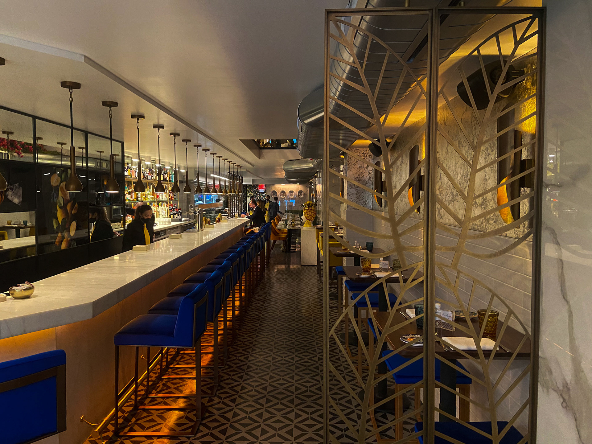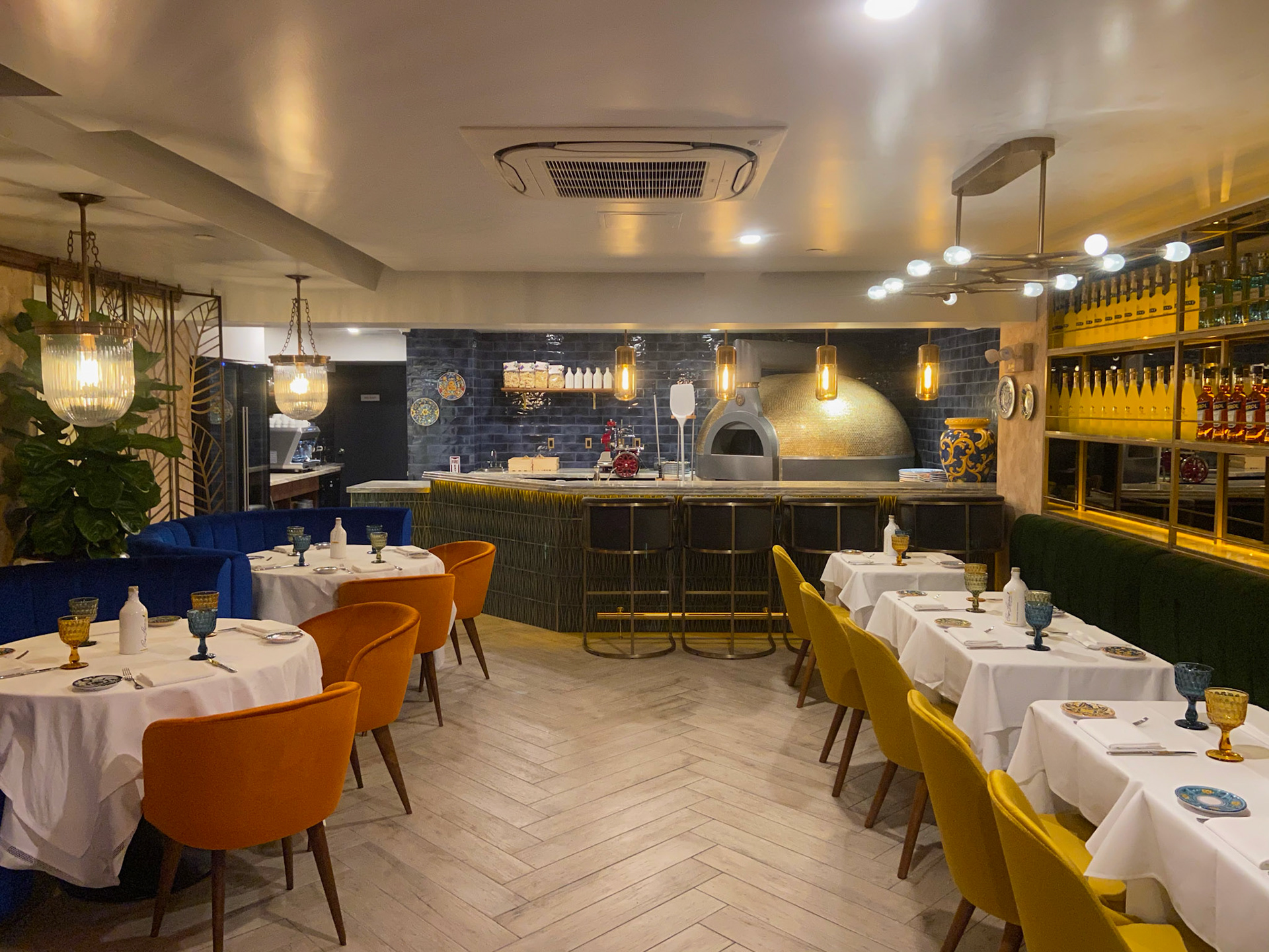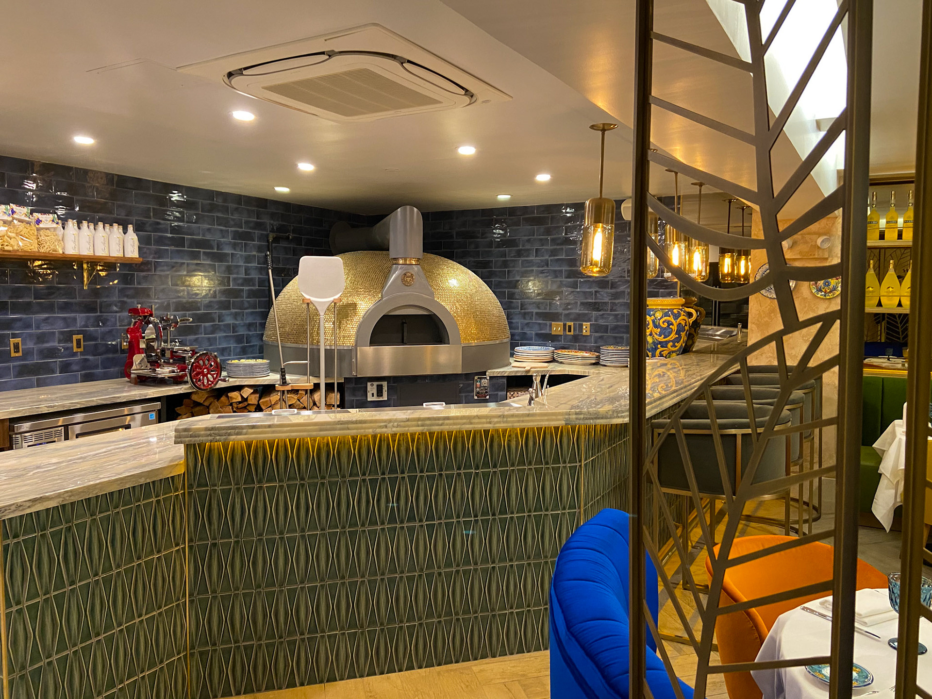 The bar and pizza counter anchor the energy of the restaurant. A long marble bar stretches confidently through the space, framed by rows of vivid Italian spirits—clear, amber, sapphire—arranged like a chromatic installation. The mosaic-clad wood-burning oven glimmers in gold, paying homage to Southern Italy’s culinary heart while acting as a visual beacon for the entire room.