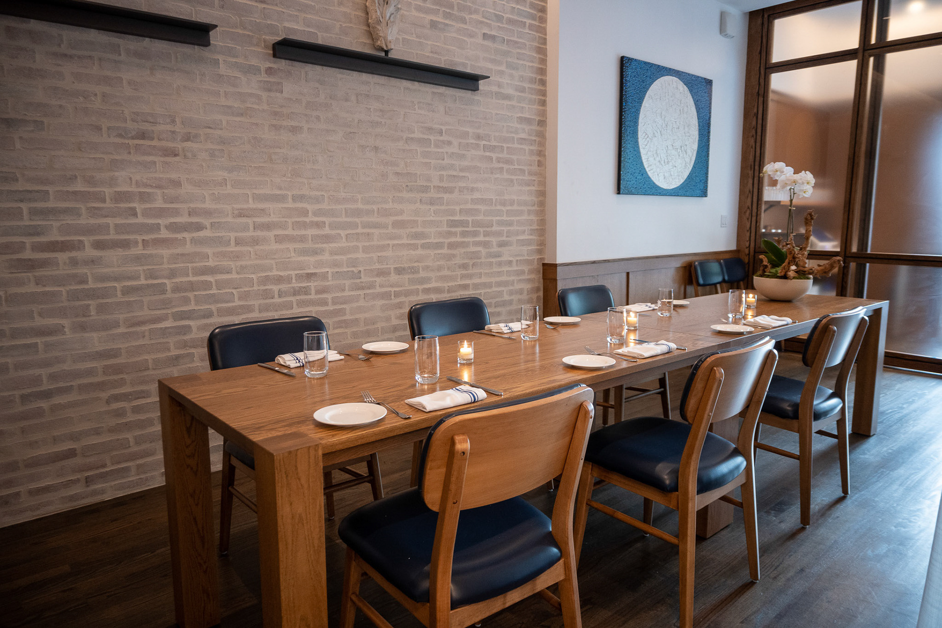 Blue-toned sculptural pieces echo the color of the Aegean and bring a sense of movement across the walls, while lanterns, small potted herbs, and natural greenery extend the restaurant’s theme of lived-in warmth.