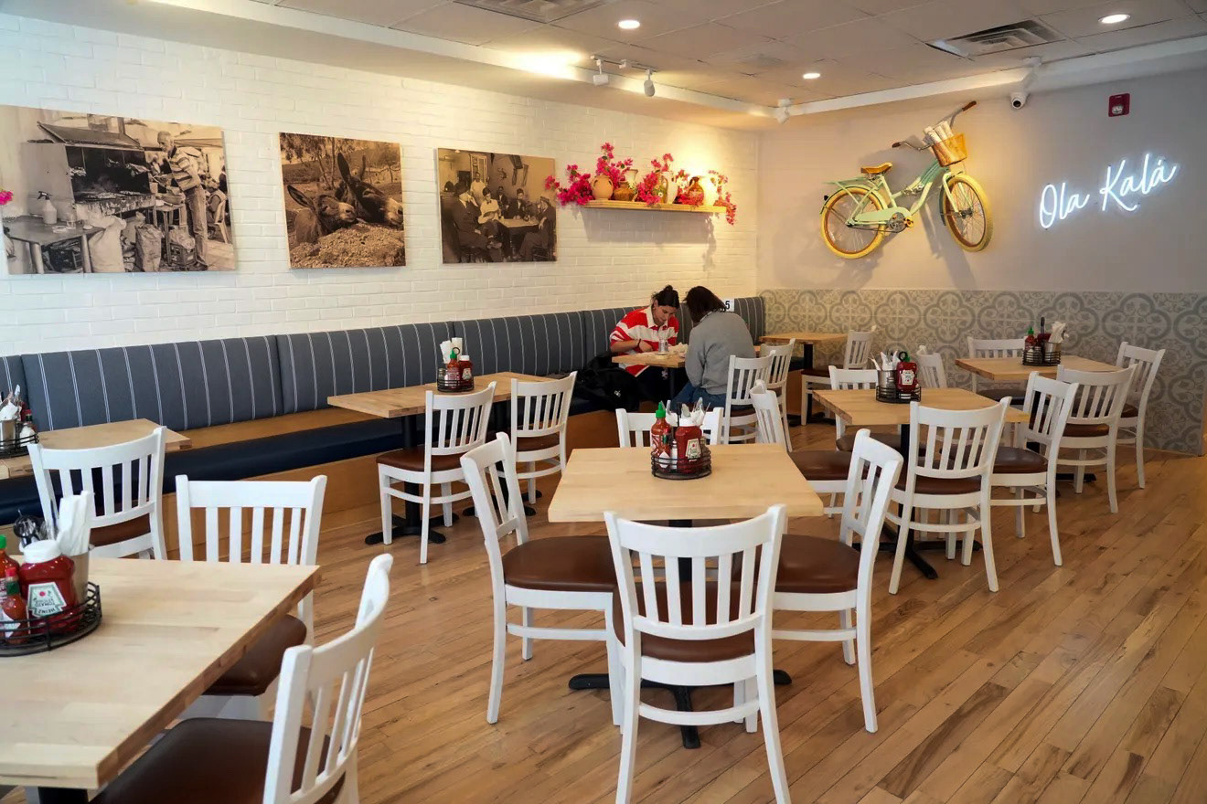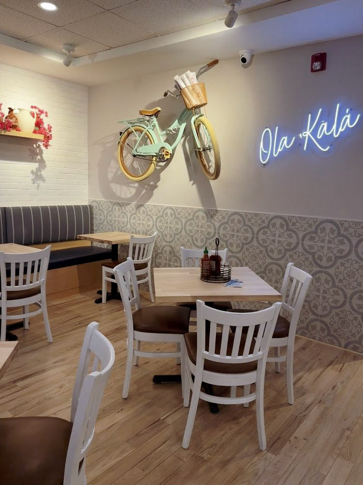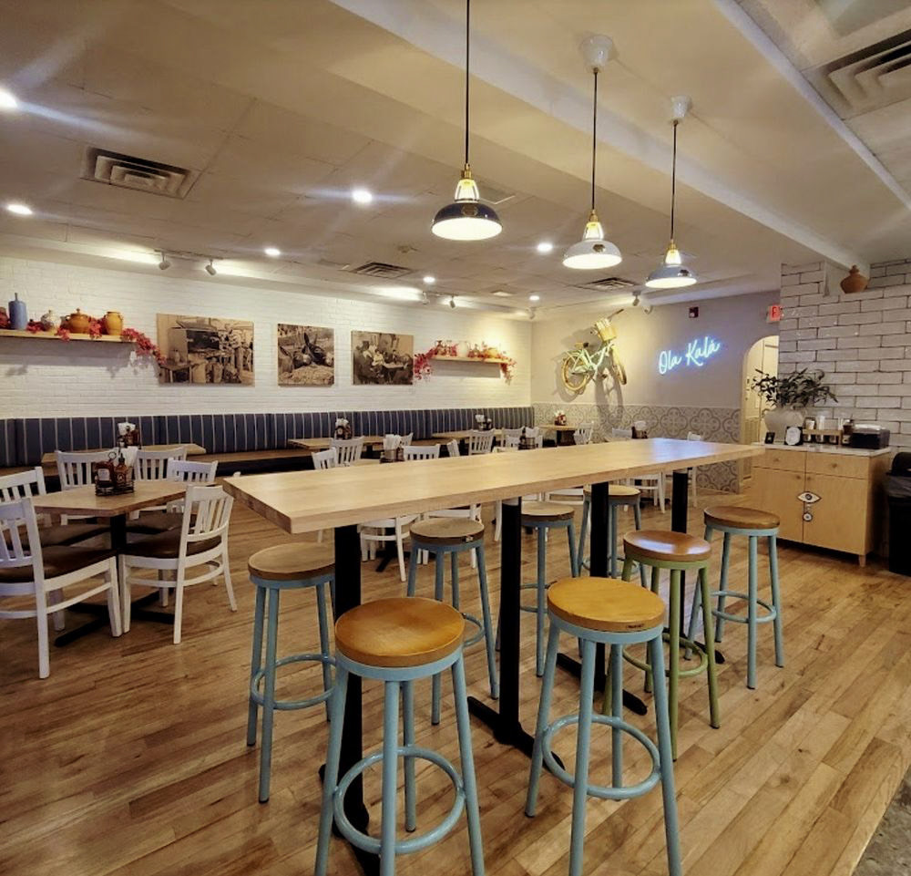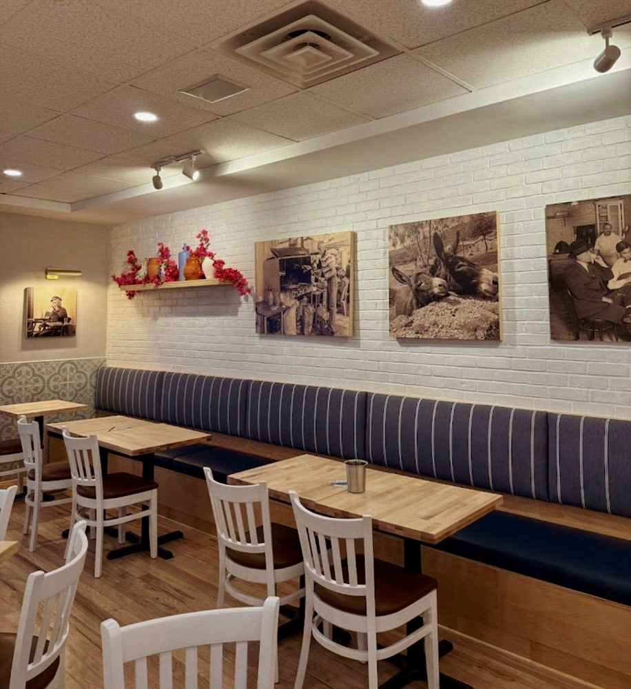 The dining room is airy and inviting, lined with long striped banquettes, white brick walls, and custom millwork. Vintage-style photographic prints of Greek village life add a nostalgic cultural layer, while playful accents—such as Mediterranean pottery, greenery, and a hanging bicycle with a basket—introduce personality and charm. The “Ola Kalá” neon sign becomes a friendly signature moment within the space, reinforcing the optimism and hospitality at the heart of Greek culture.