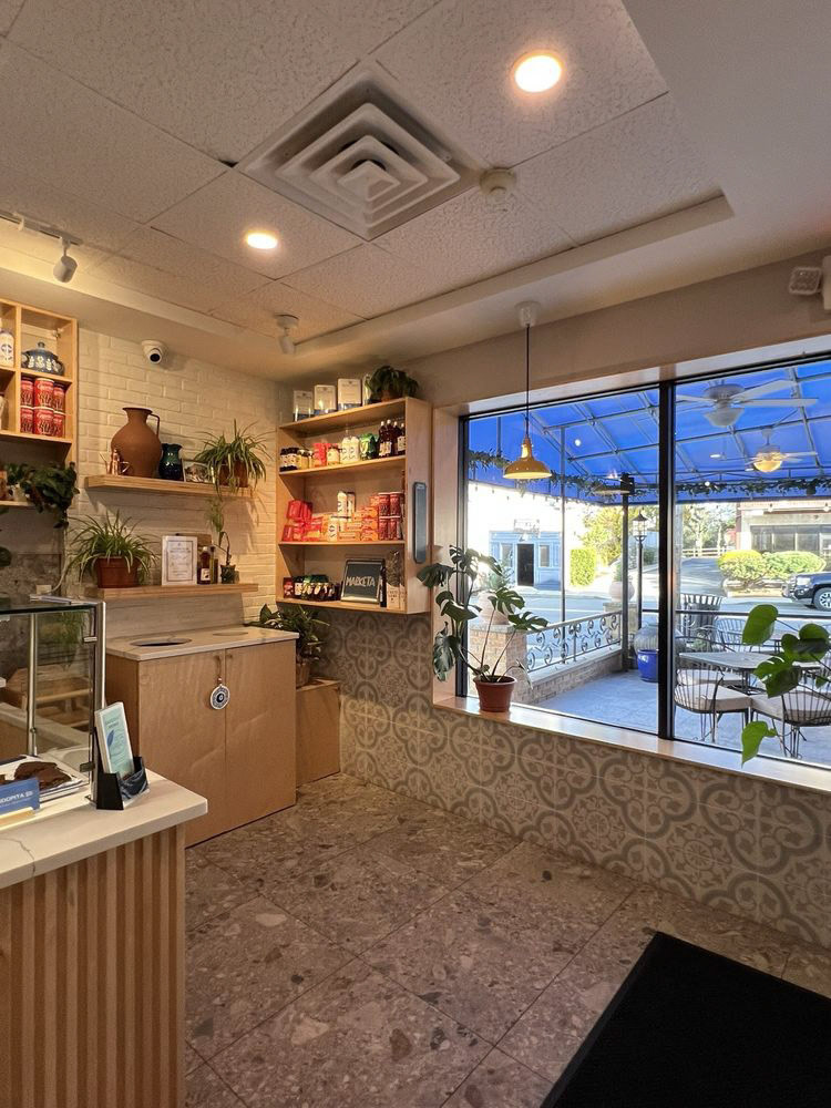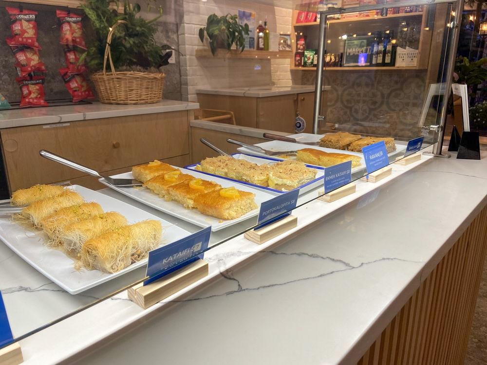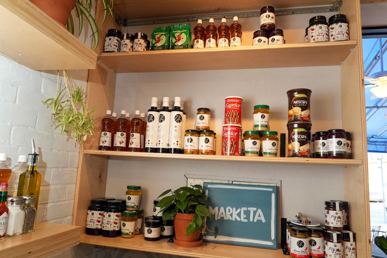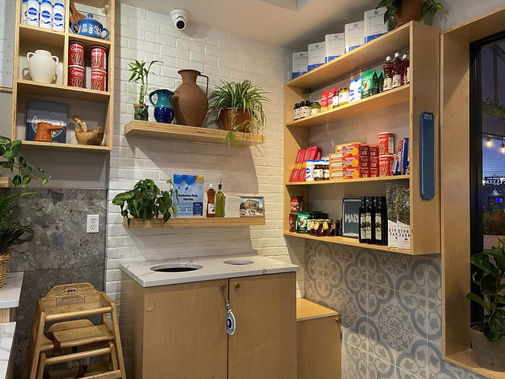 At the heart of the interior, the ordering counter is framed in vertical slatted wood and topped with crisp white quartz, setting a clean and contemporary tone. Soft grey terrazzo flooring and warm pine shelving continue the natural story, creating a casual yet thoughtfully curated market feel. Open shelves showcase imported products, olive oils, and small-batch Greek goods, reinforcing the authenticity of the culinary experience.