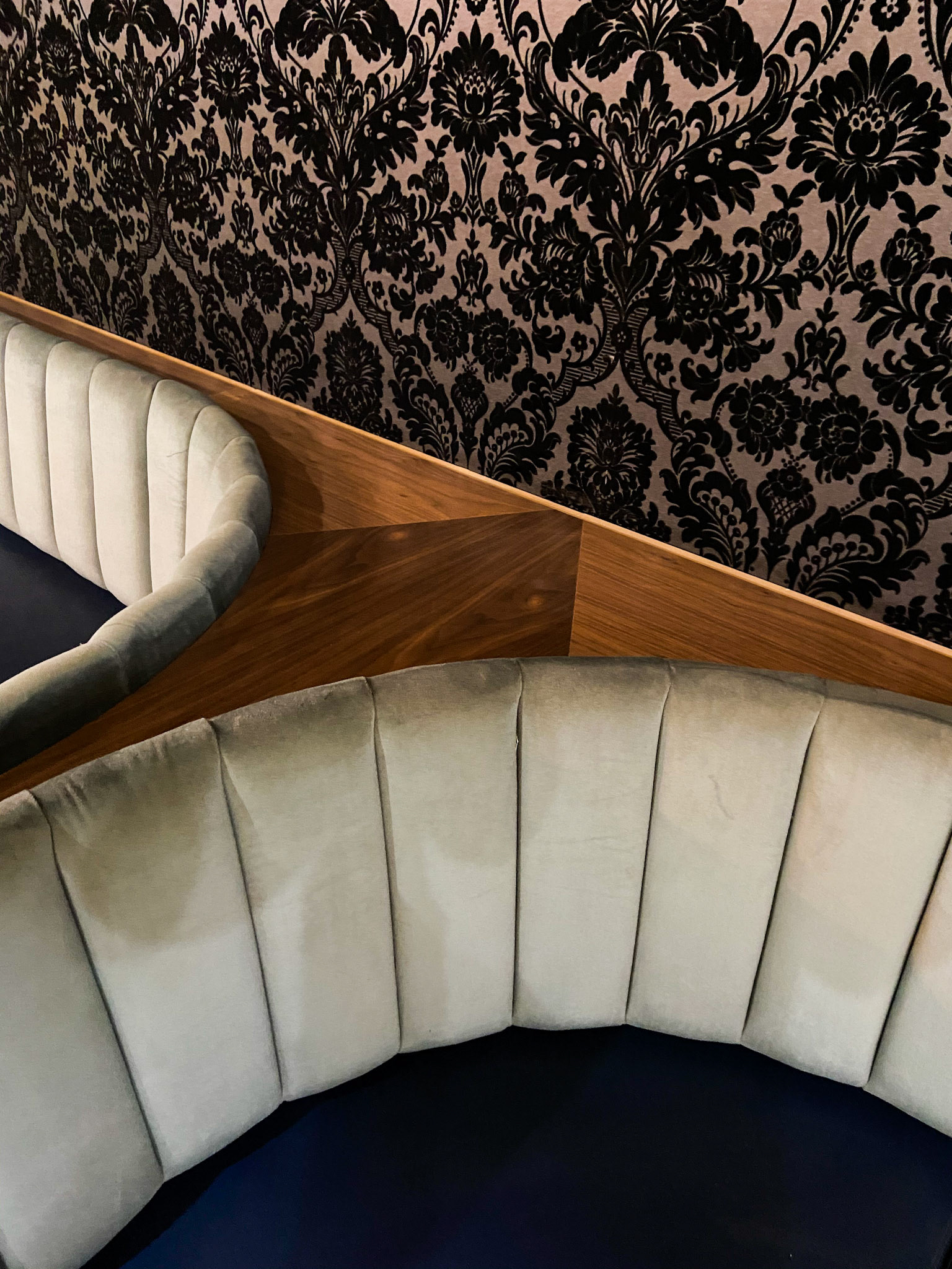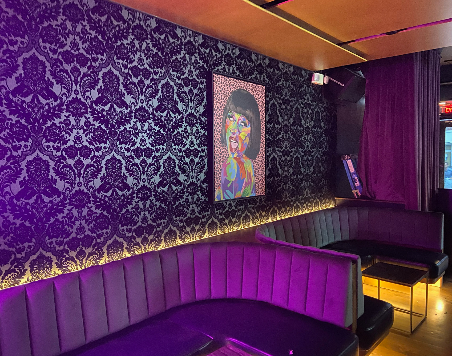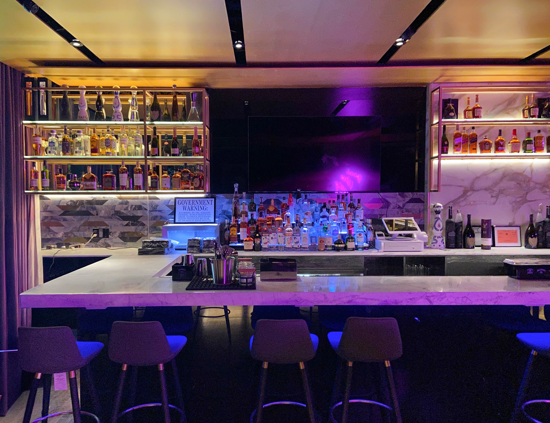 Vybz Astoria is an immersive bar and lounge that blends bold lighting, luxurious textures, and expressive artwork into a vibrant nightlife setting. A long marble bar framed in brass, channel-tufted banquettes, neon accents, and lush greenery moments create a dynamic atmosphere that shifts effortlessly from cocktail lounge to late-night energy. Rich damask walls, saturated lighting, and sculptural seating give the space its signature mood—sophisticated, intimate, and unapologetically bold.